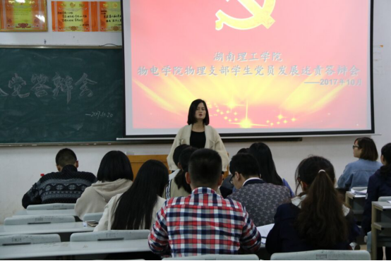 10月20日下午6点,物理与电子学院“学生党员发展述责答辩”活动在6102、6103和6104举行。物理学专业学生党支部书记何小娅,光电专业学生党支部书记龙颜,电子专业学生党支部书记张恒道和各支部支委组成了答辩评审委员会,各支部入党积极分子参加了此次活动。