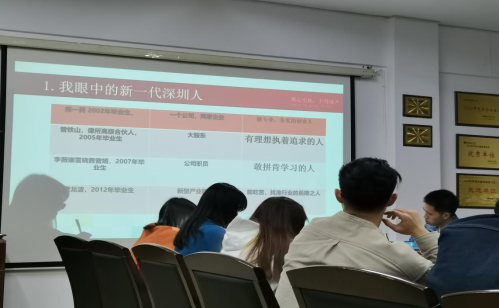 在提到“我眼中的新一代深圳人”时,他列出了在深圳发展的湖南理工学院的六位优秀毕业生的例子,他将他眼中的新一代深圳人分为四类:务实的创业人、执着追求理想的人、敢拼肯学习的人、