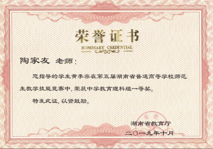 在学生特长培养方面,陶家友同志在充分了解学生的基础上,根据学生的兴趣正确引导,因材施教,充分挖掘学生潜力,帮助学生成长。迄今指导学生获得湖南省普通高等学校师范生教学技能竞赛一等奖、三等奖各1项;湖南省大学生物理竞赛一等奖1项,二等奖1项,三等奖6项;全国大学生电工数学建模竞赛三等奖1项。