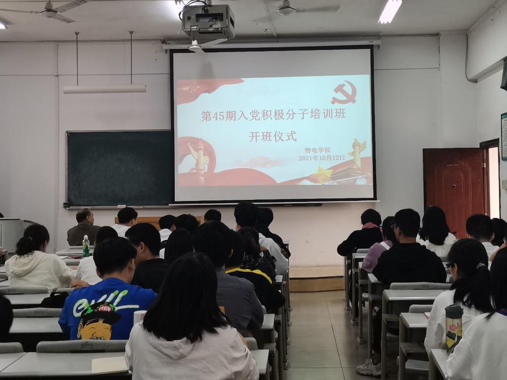 10月12日中午,K体育·「中国」官方网站第45期入党积极分子培训班开班仪式在物电楼6103教室举行。K体育·「中国」官方网站党委书记周畅、副书记李科敏、学生第一党支部书记何小娅、第二党支部书记严胡伟老师出席,全体学员参加,何小娅主持。