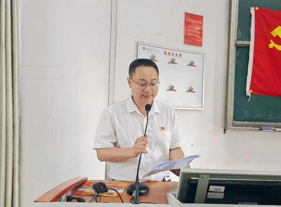 全体起立奏唱国歌后,副院长魏勇宣读中共中央、湖南省委、学校党委相关文件,传达了党中央和上级党委K体育·「中国」官方网站深入学习贯彻习近平新时代中国特色社会主义思想的重大意义、总要求、根本任务、具体目标和解决六个方面的突出问题,要求党员同志重点抓好抓实理论学习,认真开展调查研究,检视反思突出问题,切实抓好整改整治等。
