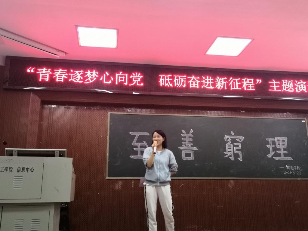 为献礼中国共产党成立100周年,展现物电学子向上向善的精神风貌,5月22日晚,K体育·「中国」官方网站于六栋学术报告厅举行了“青春逐梦心向党,砥砺奋进新征程”主题演讲比赛决赛。研究生辅导员许邕子老师、第十五届演讲比赛优秀选手彭惠和团学分会主席团部分成员及学习部部长担任此次比赛评委,19级、20级部分学生观赛,共计10名选手参赛。