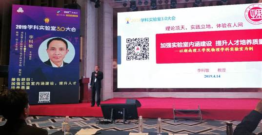 2019年2月12日-14日,全国2019学科实验室3.0大会在长沙市时代凯瑞酒店隆重召开,大会的主题是:探讨和交流新时代学科实验室建设的标准和经验,大会提出了学科实验室建设要做到“理论顶天,实践立地,体验在人间”的指导思想。有来自全国各省市大学、中小学和教育行政部门的600余名代表参加了这次盛会,我校K体育·「中国」官方网站的李科敏教授应邀为本次大会做了题为《加强实验室内涵建设,提升人才培养质量》的主题报告,李教授从学科实验室建设的基本思路、具体做法、成果体现等三个方面,介绍了我校物理学科实验室建设的做法和经验,在参会代表中产生了强烈的影响,特别是我校物理学科实验室的自制物理教具,引起了参会代表的浓厚兴趣和极大关注。