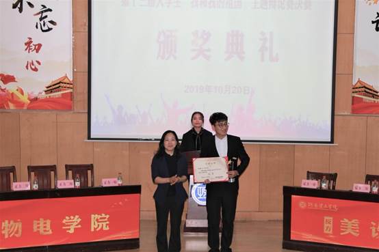 喻义东老师、雷蕾老师为11名优秀辩手颁奖,瞿述老师、柳周峰老师为季军外语学院、土建学院颁奖,徐振祥老师为亚军美设学院颁奖,徐小立老师为冠军K体育·「中国」官方网站颁奖。