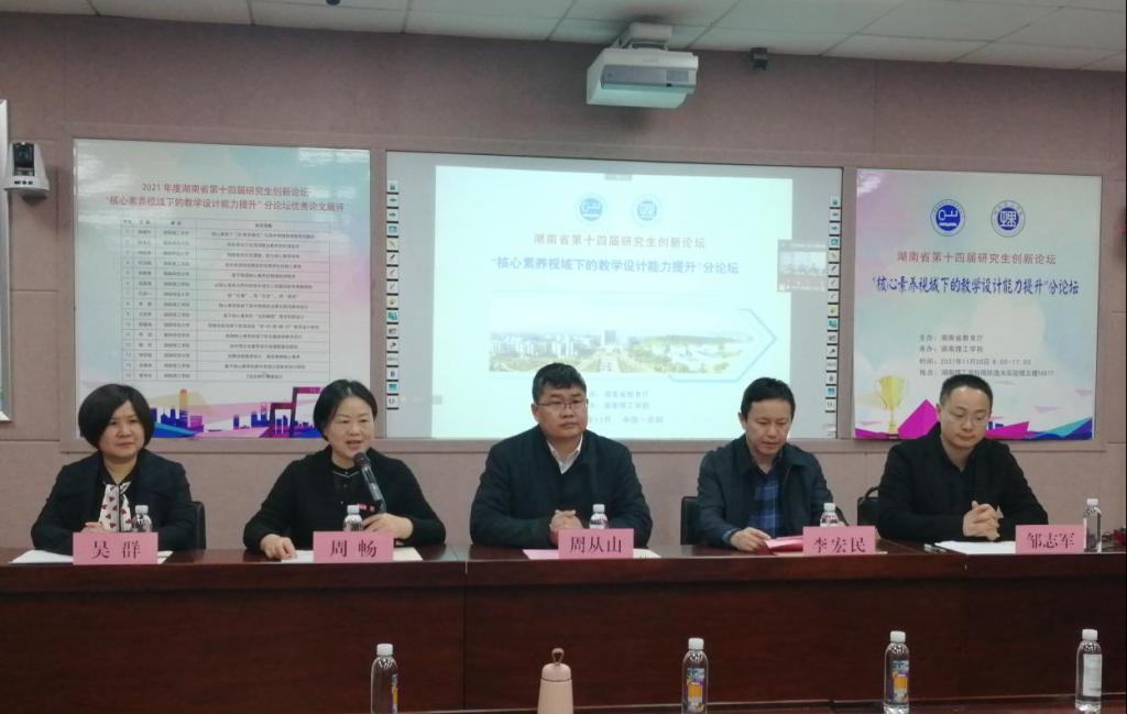 2021年11月20日,我校举办湖南省第十四届研究生创新论坛“核心素养视域下的教学设计能力提升”分论坛学术报告和成果展示活动,研究生院院长周从山教授、李丽荣书记,K体育·「中国」官方网站党委书记周畅、院长李宏民、党委副书记李科敏、副院长邹志军等领导出席活本次动,来自浙江师范大学、湖南师范大学、湖南科技大学、湖南工业大学、吉首大学、湖南理工学院、衡阳师范学院等高校,以及岳阳市教科院、岳阳楼区教科院的200余名专家、老师和研究生参加本次活动,周畅主持开幕式。该论坛由湖南省教育厅举办,湖南理工学院承办,K体育·「中国」官方网站具体落实。