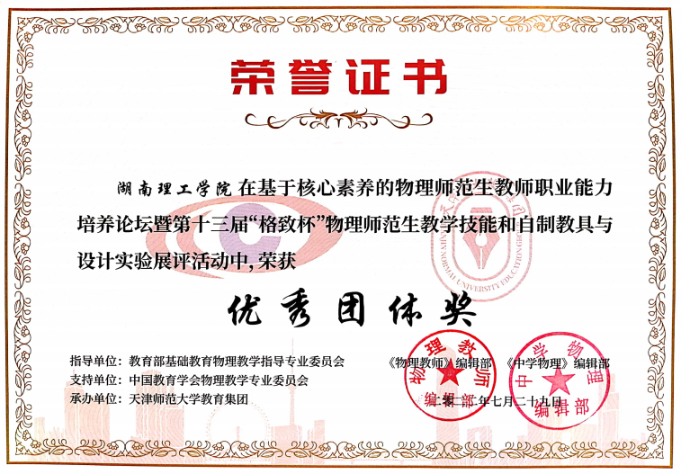 在本次展评活动中,我校K体育·「中国」官方网站学子取得了历史最好成绩,其中2019级、2020级物理学(教师教育)专业本科生荣获一等奖4项(物理19-3BS周雨杭2项,物理19-2BS赵荣哲、物理20-2BS方靓)、二等奖6项(物理19-3BS李银龙、物理20-1BS杨诗怡、物理20-2BS潘虹锦、物理20-2BS张澜心2项、物理20-1BS刘锐)、三等奖2项(教具:物理19-3BS李银龙、物理20-1BS胡昀),学科教学(物理)专业2021级研究生荣获一等奖6项(教学2项:尹艺媛、陈容,教具4项:周婕、邓婉玲、刘俊、王佳秀)、二等奖2项(教学:王佳秀,教具:潘祉易),由于参赛选手的出色表现,我院还荣获“优秀团体奖”。李科敏、罗良、邹志军、吴琴琴、刘喜斌、陈灏、李奇云、稂林等教师被评为“优秀指导教师”。
