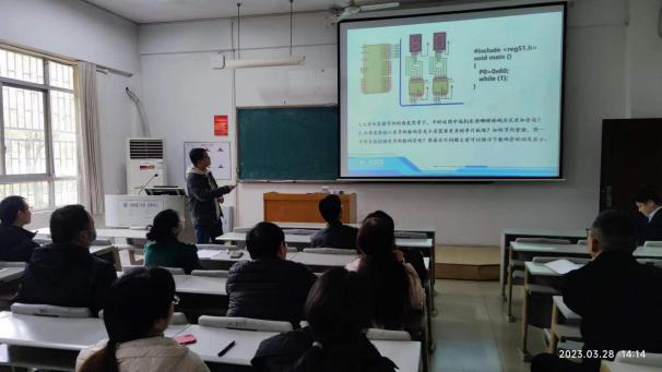 孙小香博士针对《微电子器件基础》课程进行了10分钟的说课和5分钟的教学片段展示。说课围绕课程概述、学情分析、思政融入和建设成效四个方面展开,从整体上概括了《微电子器件基础》课程的课程地位、对专业人才培养的贡献以及思政改革对课程成效的提升。教学片段展示对第五章第二节MOS场效应晶体管工作原理进行讲解,以前沿科技状况为切入点,采取信息化手段、分组讨论和动画展示等方式,融入我国“神威”计算机研制成功、“芯战”带来的科技差距等思政元素,调动学生学习热情,激发学生学好该课程的责任感使命感。禹卓良博士以《单片微机原理》第11章第1节的“LED数码管静态显示”为例,介绍了LED数码管的结构和显示原理,比较了硬件译码和软件译码的区别。在课程讲授的过程中融入了 “资源节约”、“十四五规划”以及“学习雷锋精神”等思政内容。