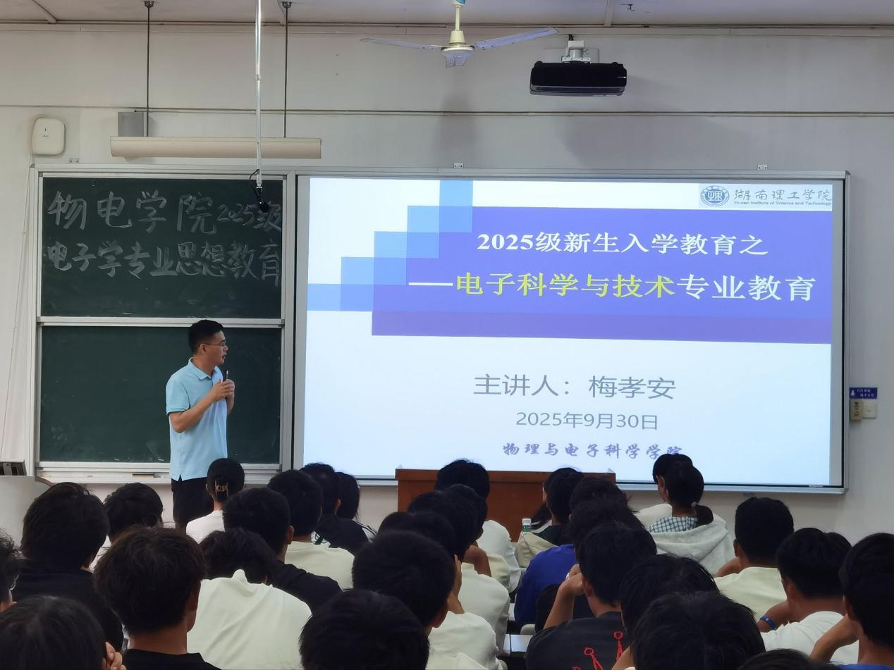 电子科学与技术专业教育由教研室主任梅孝安主讲,他从学院办学基础切入,结合毕业去向解读专业培养方案,强调高等数学、大学外语、C语言等核心课程的学习意义,鼓励新生珍惜时光,兼顾理论学习与实践参与,为未来筑牢基础。