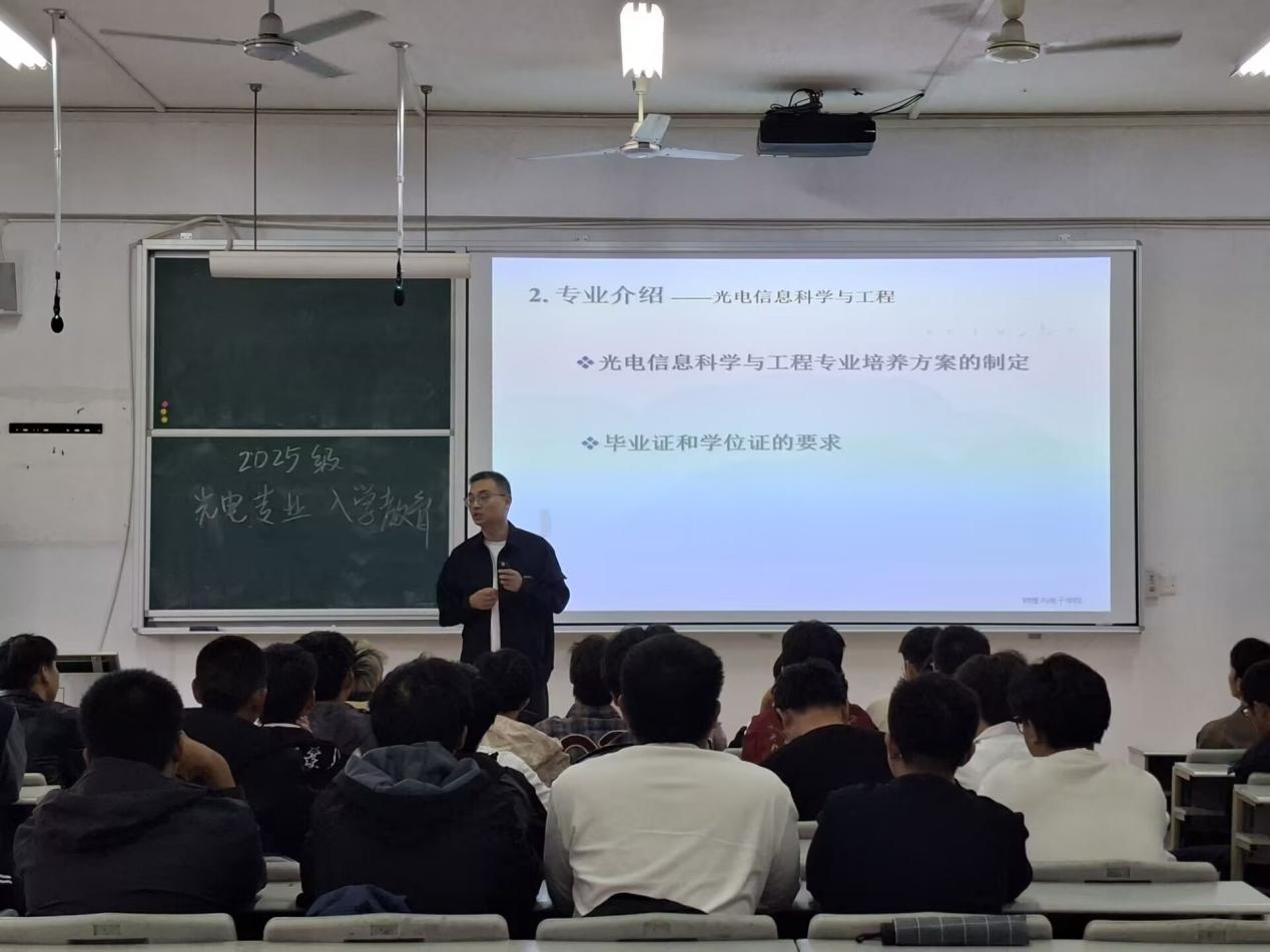 光电信息科学与工程专业由教研室主任金佳鸿博士主讲。他介绍了学院实验室、仪器设备及领域优秀教师,鼓励新生多进实验室交流、重视实践以提升动手能力;解读了专业培养方案,强调基础专业课的“垫脚石”作用,同时为新生做了细致的就业分析。