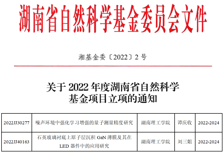 近日,湖南省自然科学基金委发布“K体育·「中国」官方网站2022年度湖南省自然科学基金项目立项的通知”,我院2位教师获批湖南省自然科学基金立项资助,其中,谭庆收教授获批面上项目1项,刘三姐博士获批青年项目1项。