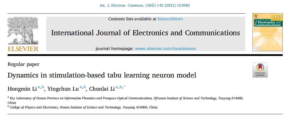 近期,李宏民教授课题组在国际权威学术期刊《International Journal of Electronics and Communications》发表题为“外界刺激条件下禁忌学习神经元模型的动力学研究”(Dynamics in stimulation-based tabu learning neuron model)的研究论文。论文第二作者路迎春为我校信息与通信工程专业2020级硕士研究生。论文基本信息如图1。