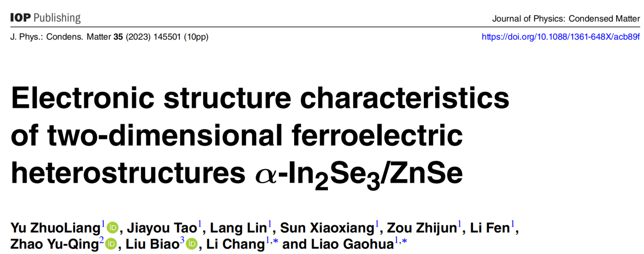 近期,禹卓良博士在国际学术期刊《Journal of Physics: Condensed Matter》发表题为“铁电异质结构α-In2Se3/ZnSe的电子结构特性”(Electronic structure characteristics of two-dimensional ferroelectric heterostructures α-In2Se3/ZnSe)的研究论文。论文通讯作者是我院的李昶博士和廖高华博士。论文基本信息如图1。