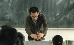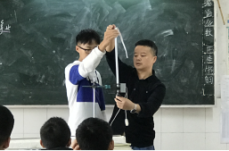 图3 刘杰老师与学生共同进行演示实验       图4 刘杰老师与学生课堂互动