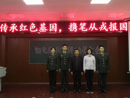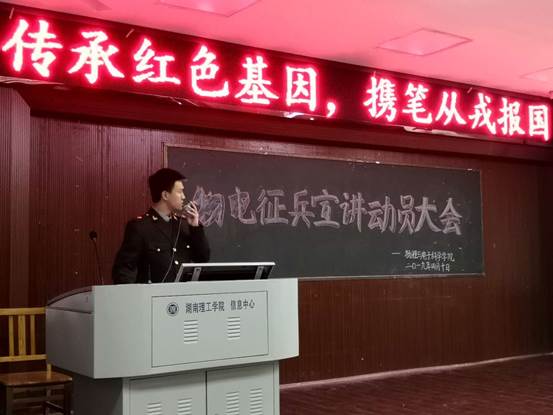 2019年4月10日晚,K体育·「中国」官方网站在6栋教学楼学术报告厅举行征兵宣讲动员大会。K体育·「中国」官方网站党总支书记罗文华老师,征兵专干何小娅老师,退伍老兵代表胡杨鑫、宋宏科、潘威丽等出席,18级全体男生参与此次宣讲活动。