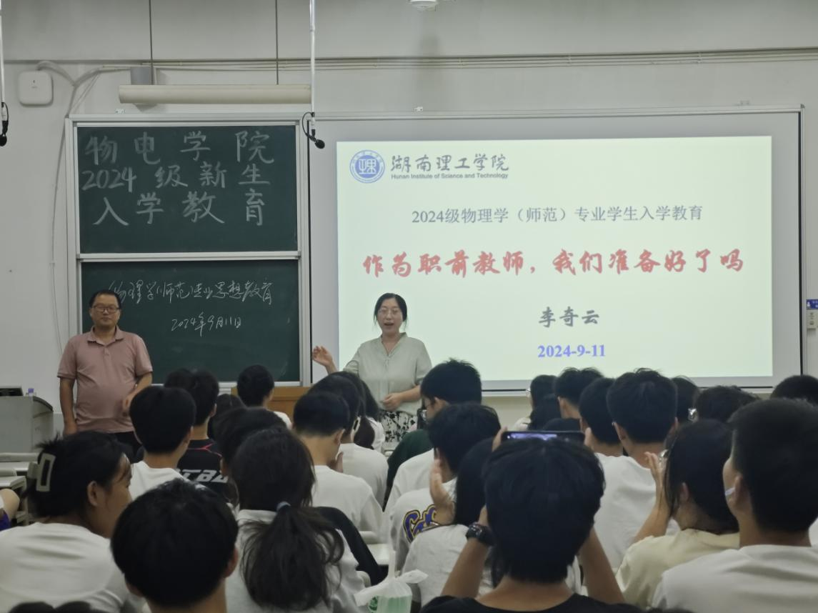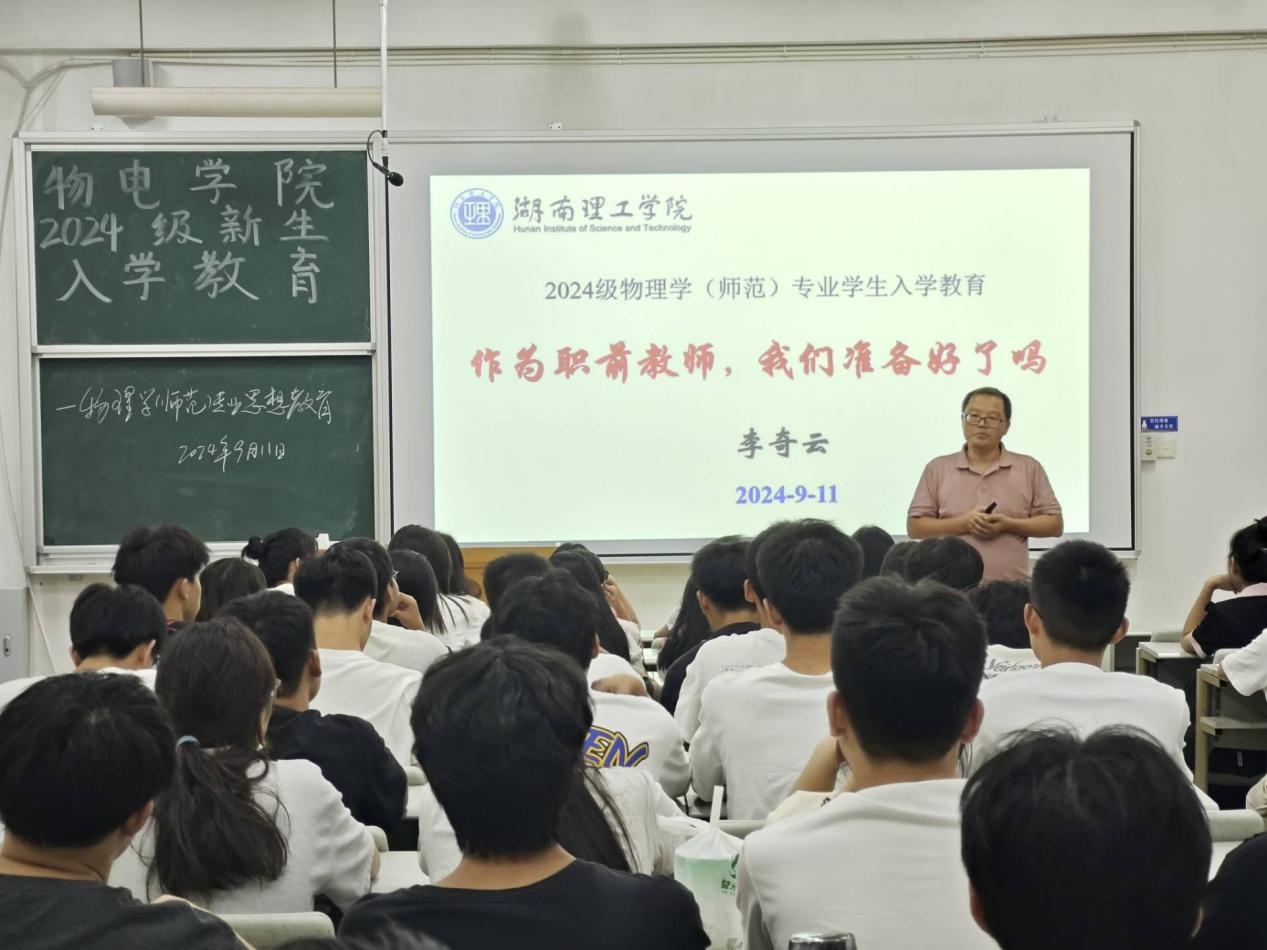 为帮助2024级新生尽快适应大学学习生活,做好生涯规划,促进大学期间全面发展与健康成长,为成为未来优秀教师打好基础,9月11日晚,K体育·「中国」官方网站在6102教室召开物理学(师范)专业思想教育讲座。K体育·「中国」官方网站教研室主任李奇云老师主讲,K体育·「中国」官方网站党委副书记石红芳、2024级物理学(师范)专业班主任李意芝、李磊出席,2024级物理学(师范)专业全体同学参加。