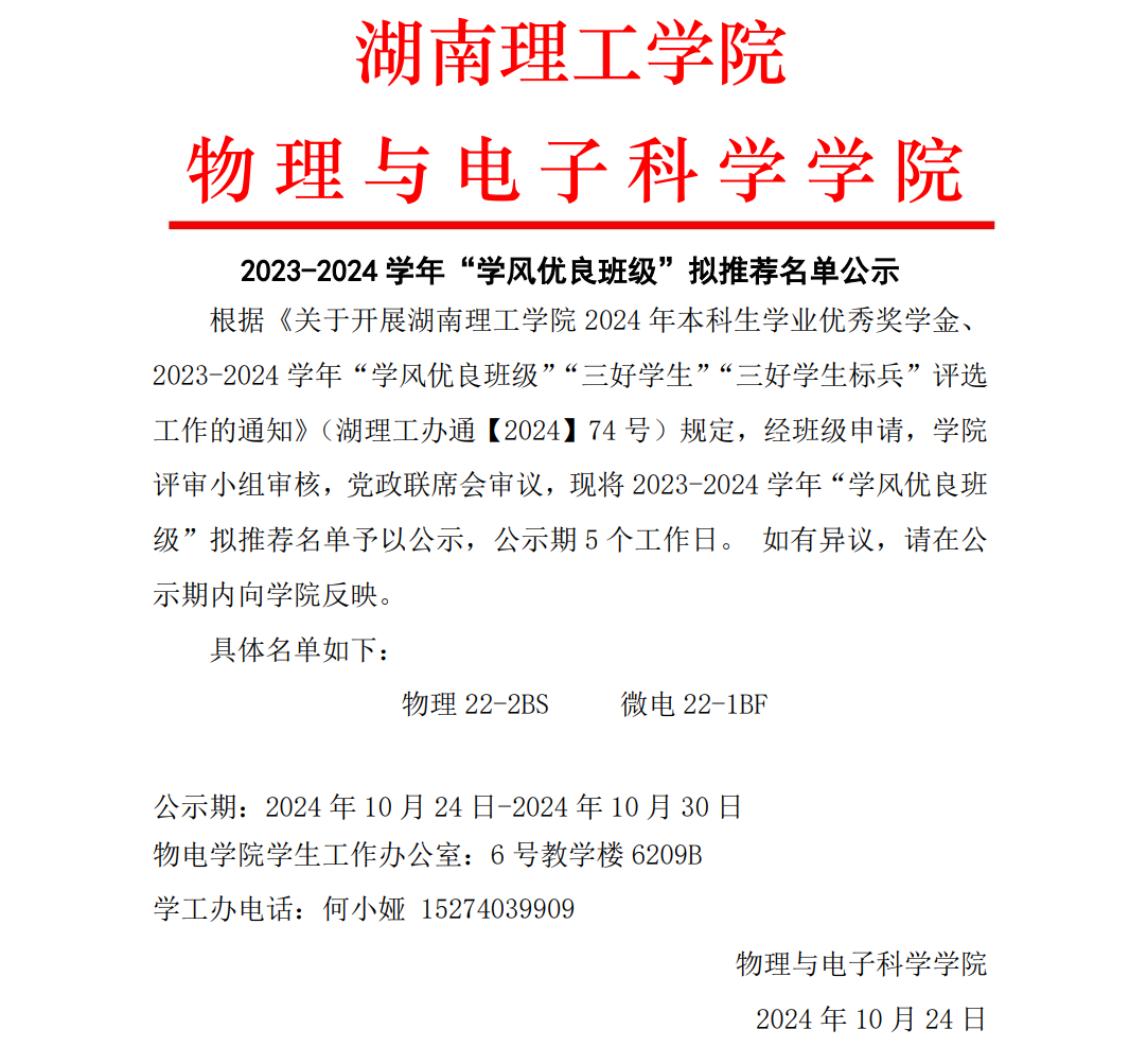 湖南理工学院K体育·「中国」官方网站 2023-2024 学年“学风优良班级”拟推荐名单公示