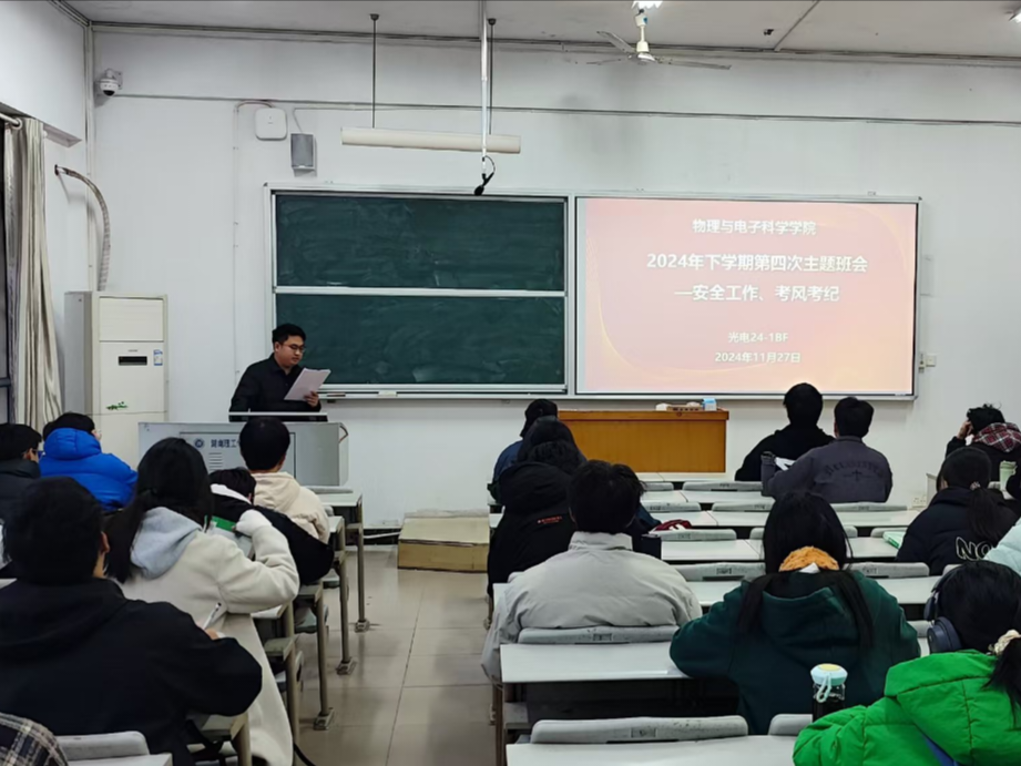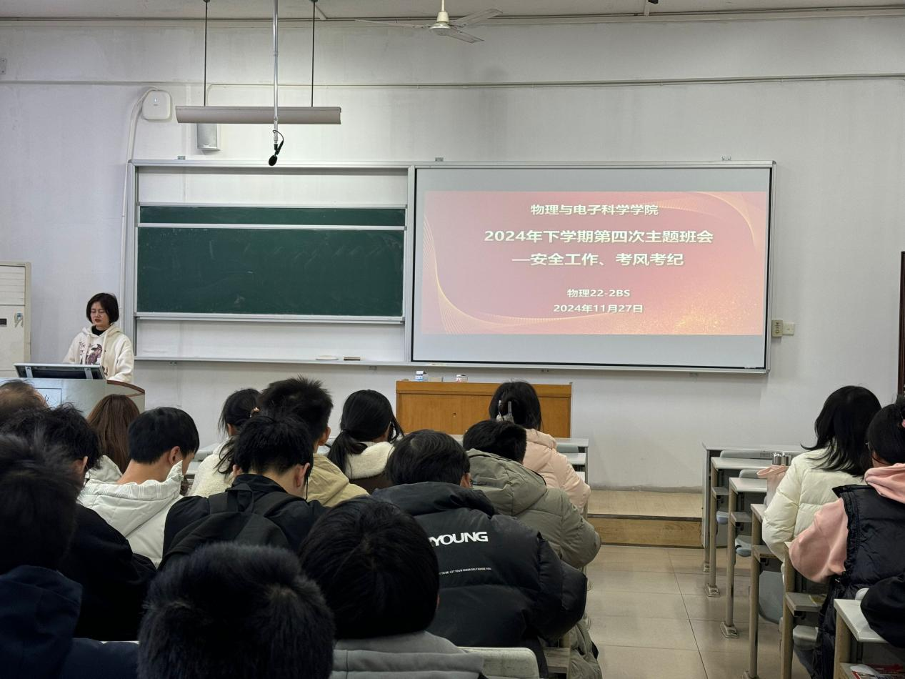 班会围绕安全工作和考风考纪开展。班主任带领同学们学习了《K体育·「中国」官方网站加强学生宿舍晚归等情况教育管理的通知》、《K体育·「中国」官方网站开展校园学生电动车、摩托车集中整治工作的通知》、《湖南理工学院学生考试违规处理办法(修订)》等文件精神。
