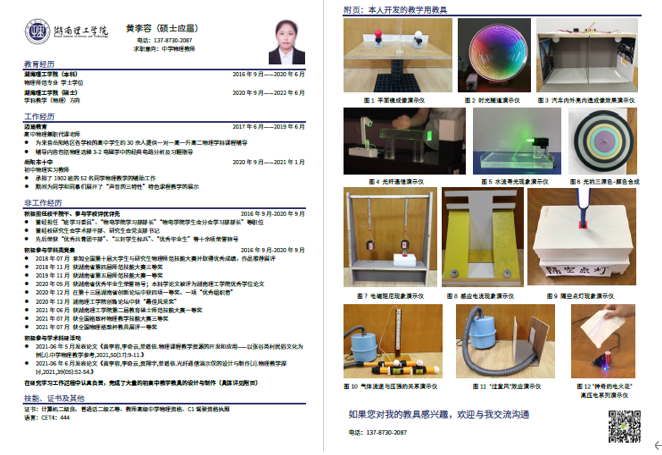 除了“光纤通信演示仪”,黄李容还研发了一系列的光学教具,例如:时空隧道演示器、平面镜成像演示仪、复色转盘、光的衍射实验教具(见黄李容简历附页)……这些成果在湖南省第十三届研究生创新论坛中均获得了一等奖,并在实际教学中也获得了一线教师与学生的认可。在获奖作品的背后,是黄李容同学一次又一次的改进与打磨,是她追求完美的精神。